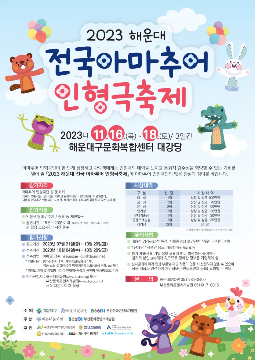 - 2023 해운대 전국 아마추어 인형극축제 요강.hwp (62.0K) 48회 다운로드 | DATE : 2023-07-21 12:20:17